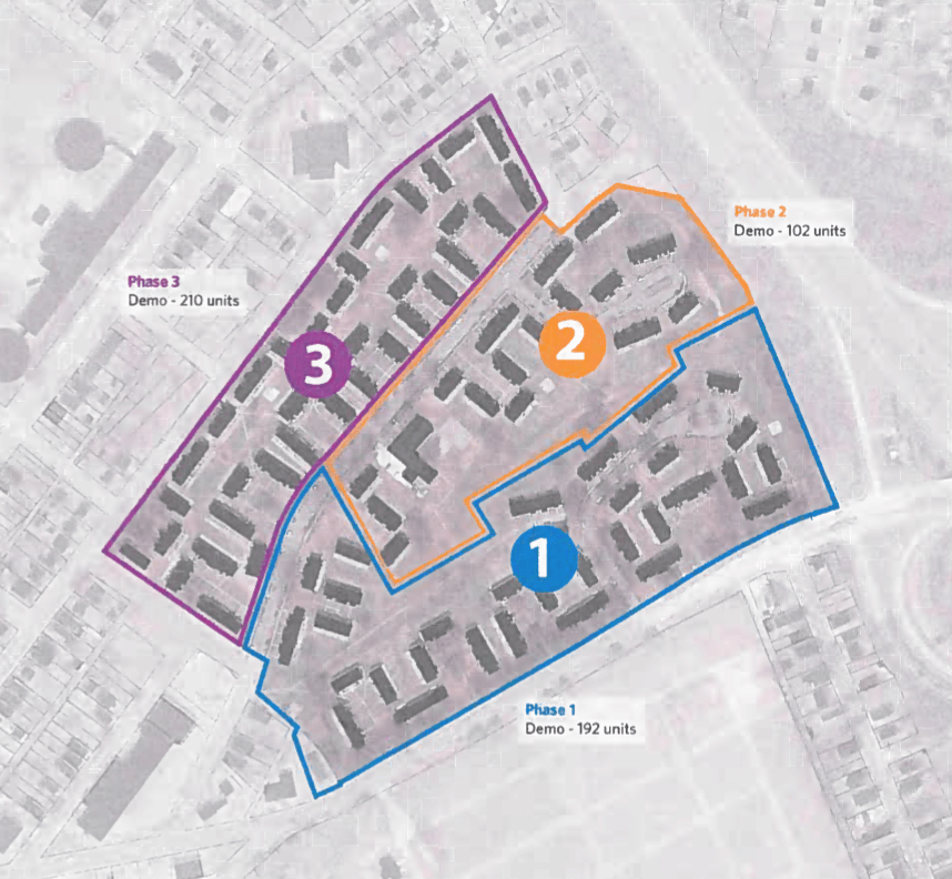 The demolition of Creighton Court will happen in three phases, which steadily displace and rehouse residents throughout the development.