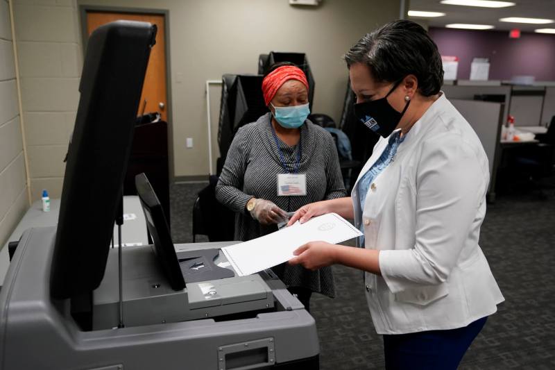 Democratic gubernatorial candidate, Virginia State Sen. Jennifer McClellan, inserts her ballot in a voting machine at an early voting location in Richmond, Va., Saturday, May 29, 2021. (AP Photo/Steve Helber)