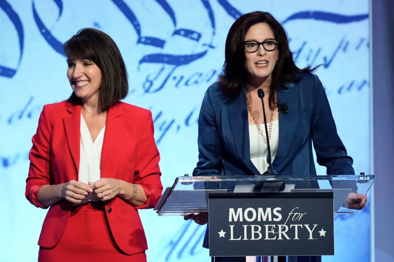 FILE – Moms for Liberty co-founders Tina Descovich, left, and Tiffany Justice, speak at the Moms for Liberty meeting in Philadelphia, Friday, June 30, 2023. (AP Photo/Matt Rourke, File)
