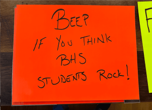 To counteract the signs Rudmin held at the high schools, a group of parents and community members came together with signs promoting positivity the following week. On Tuesday, seven people held messages like “You matter,” “You belong,” “Beep if you think BHS students rock,” and more near Broadway High School. They also had a table set up with snacks for students who walked home. Participants called the display the “BHS Wall of Love.”