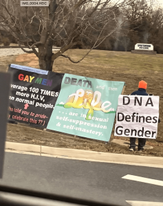 On Jan. 31, David Rudmin stood with a series of controversial signs on Broadway High School property. School administrators and a school resource officer asked him to leave, but he refused and was arrested for trespassing. The signs contained phrases like “Say no to pronouns,” “DNA defines gender,” messages about HIV, and more. The same individual recently held signs near Spotswood High School too, but the Daily News-Record reported he was not on school property during that incident.