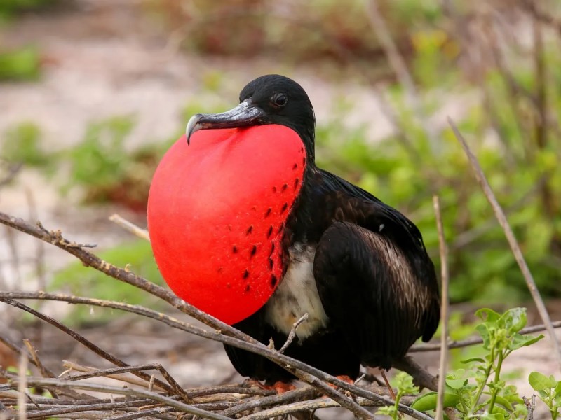 You’ll know a male Magnificent Frigatebird when you see one—it’s nearly impossible to miss (or mistake)—thanks to his bulging, bright red throat. When he’s trying to impress a lady, the bird inflates the fire engine colored pouch like a balloon.