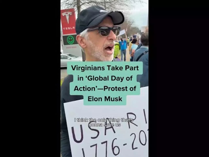 Between 100 and 200 protesters rallied at a Tesla in Tysons today against Elon Musk and the Trump administration. The action was just one of many in Virginia and around the world.