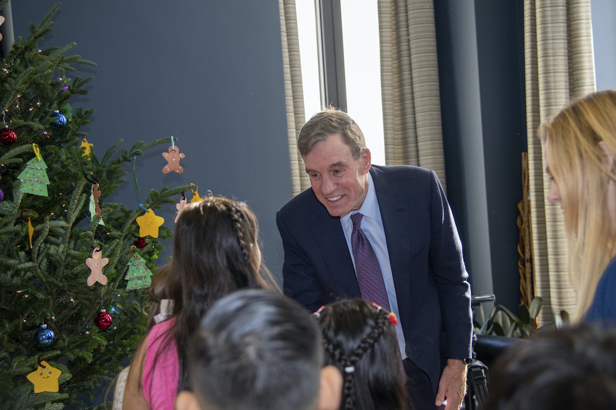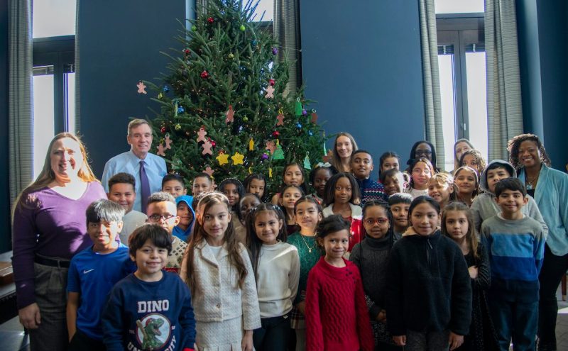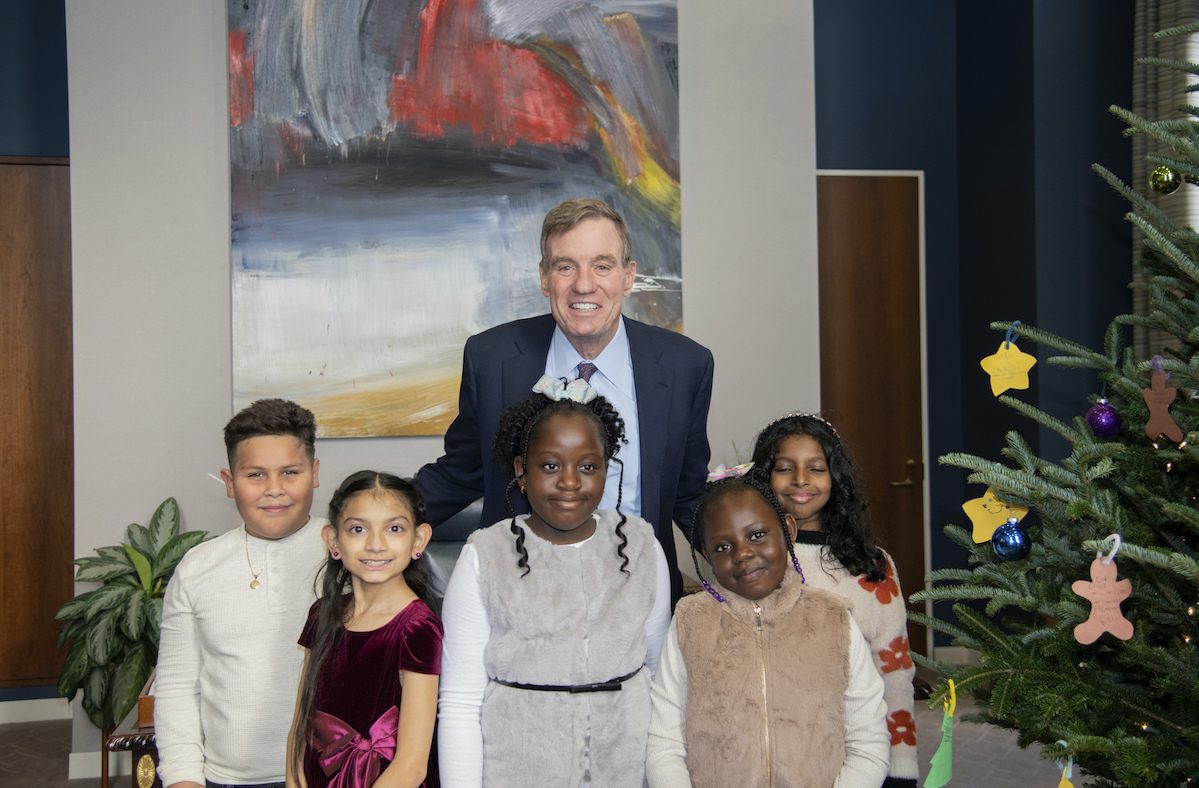 US Sen. Mark Warner’s Capitol Hill office got a festive makeover when elementary students decorated a towering Christmas tree, shared holiday cheer, and pitched their own bills for a brighter future.