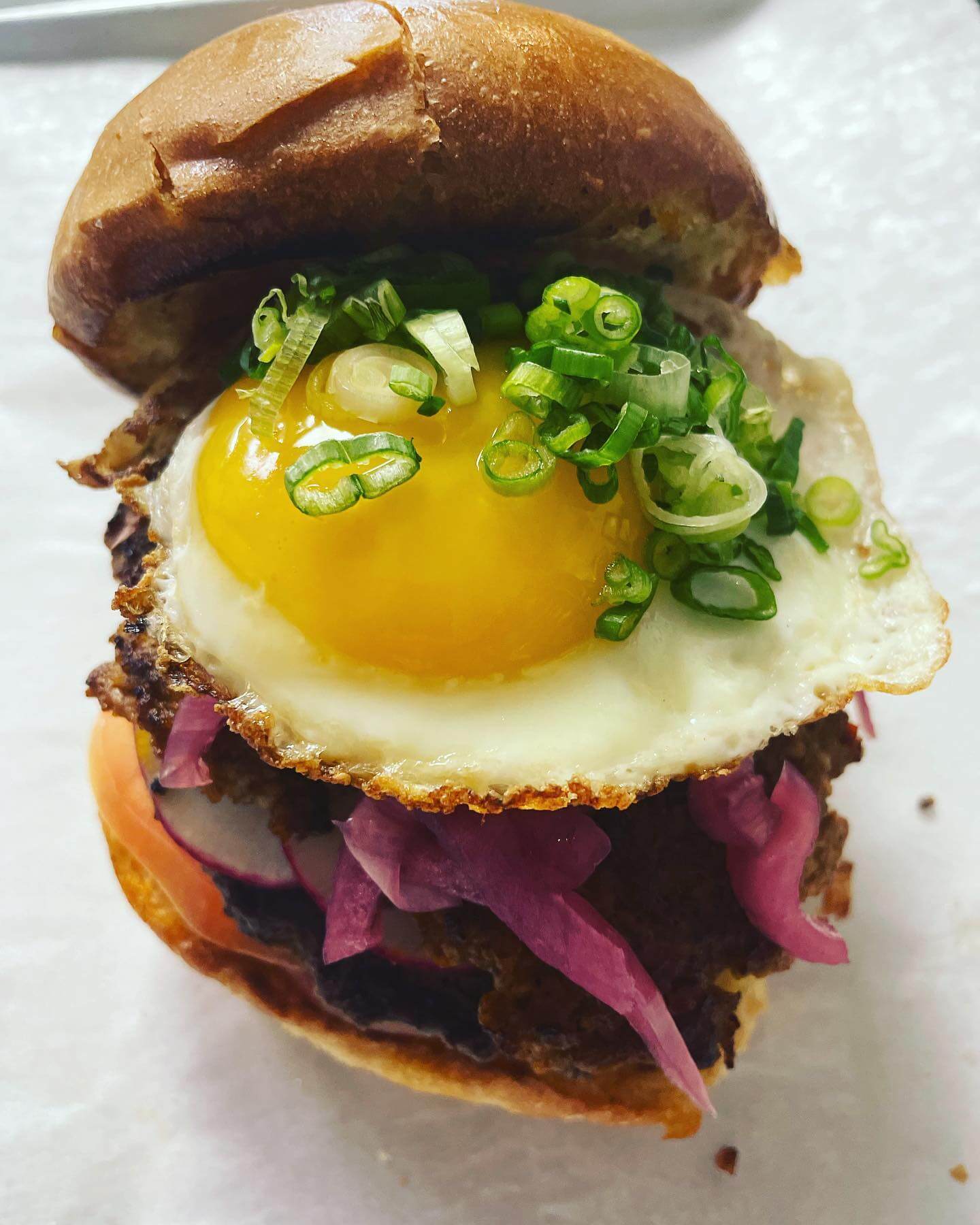 If you’re craving a burger for breakfast, try The Doughnut Burger. The half-pound patty on a freshly glazed doughnut is topped with cheddar cheese, grilled onions, an over easy egg, and bacon.