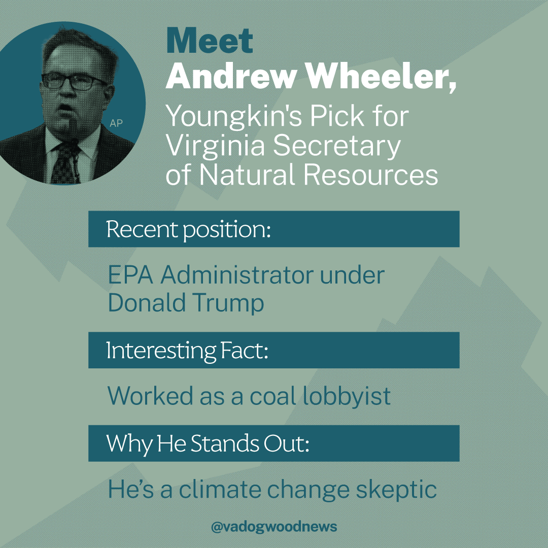 Andrew Wheeler, whose confirmation could be voted down, is Youngkin’s pick for Secretary of Natural Resources. A former coal industry lobbyist and recent EPA administrator under President Donald Trump, he pursued policies that favored businesses, not conservation.