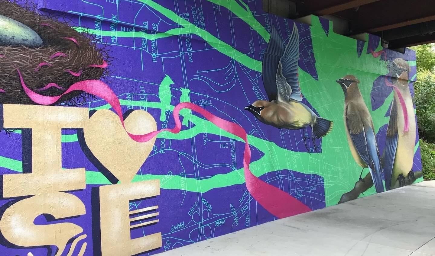 “This project represents the strength and beauty of the Southeast Roanoke community and it’s Greenways wildlife alongside the Roanoke River. Through community painting days local volunteers became an exciting part of creating this project,” Murrill told Dogwood. “The mural features the streets and neighborhoods of Southeast Roanoke as well as river wildlife symbolizing the re-birth of its community. Overall, Southeast Roanoke gained a sense of ownership and a passion for inspiring others through this unique piece of public art.”