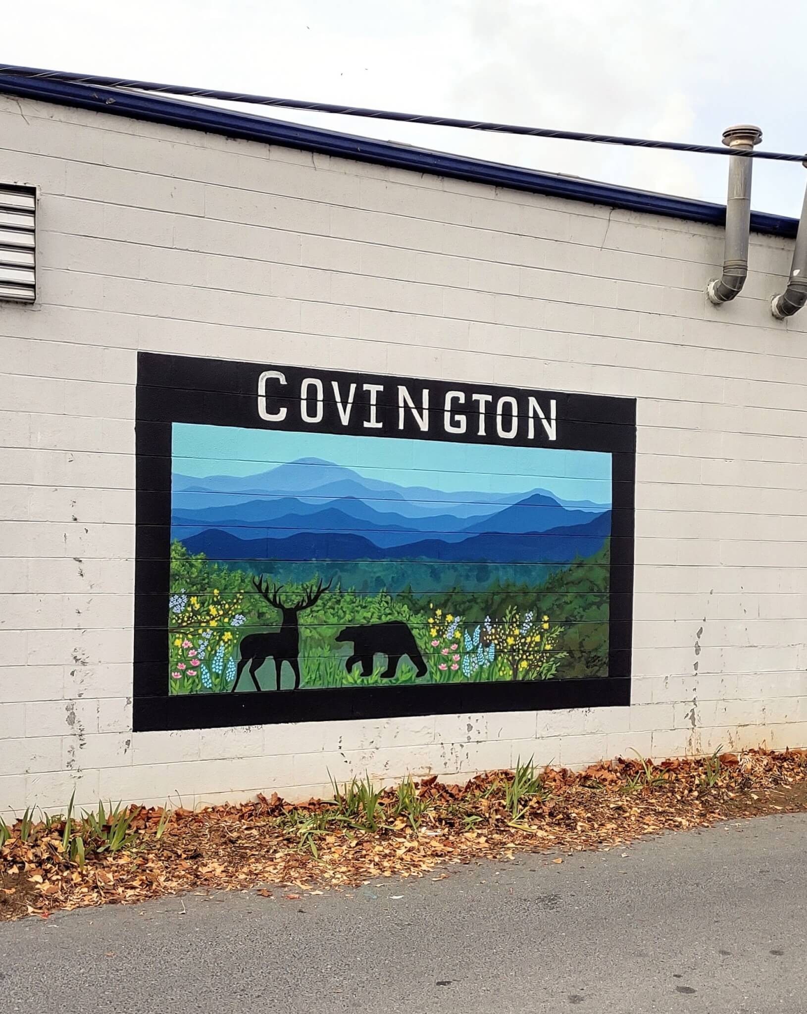 Local artist Cheyenne Renee’s inspiration for the Covington Mural came from vintage Blue Ridge Parkway postcards, which featured sharp lines with rich color and a “very recognizable blue ridge mountain scape.”