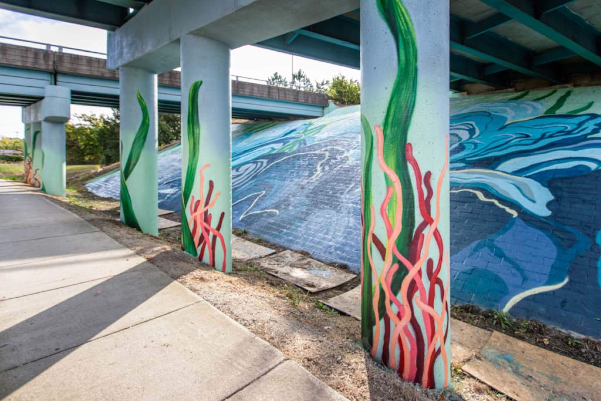 A set of murals called Oyster Bloom were installed under the Route 13 Shore Drive underpass in Virginia Beach in October of 2021 by artists Chelsea Henery and Samantha Seezox.