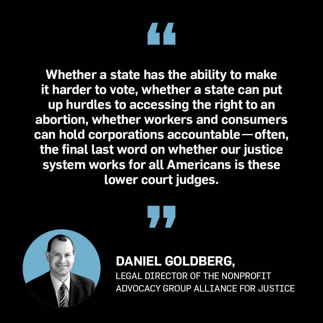 “If somebody believes they are a victim of discrimination in their workplace, the final say on whether our civil rights laws are properly enforced is a lower court judge,” Daniel Goldberg, legal director of the nonprofit advocacy group Alliance for Justice, told COURIER. “Whether a state has the ability to make it harder to vote, whether a state can put up hurdles to accessing the right to an abortion, whether workers and consumers can hold corporations accountable—often, the final last word on whether our justice system works for all Americans is these lower court judges.”