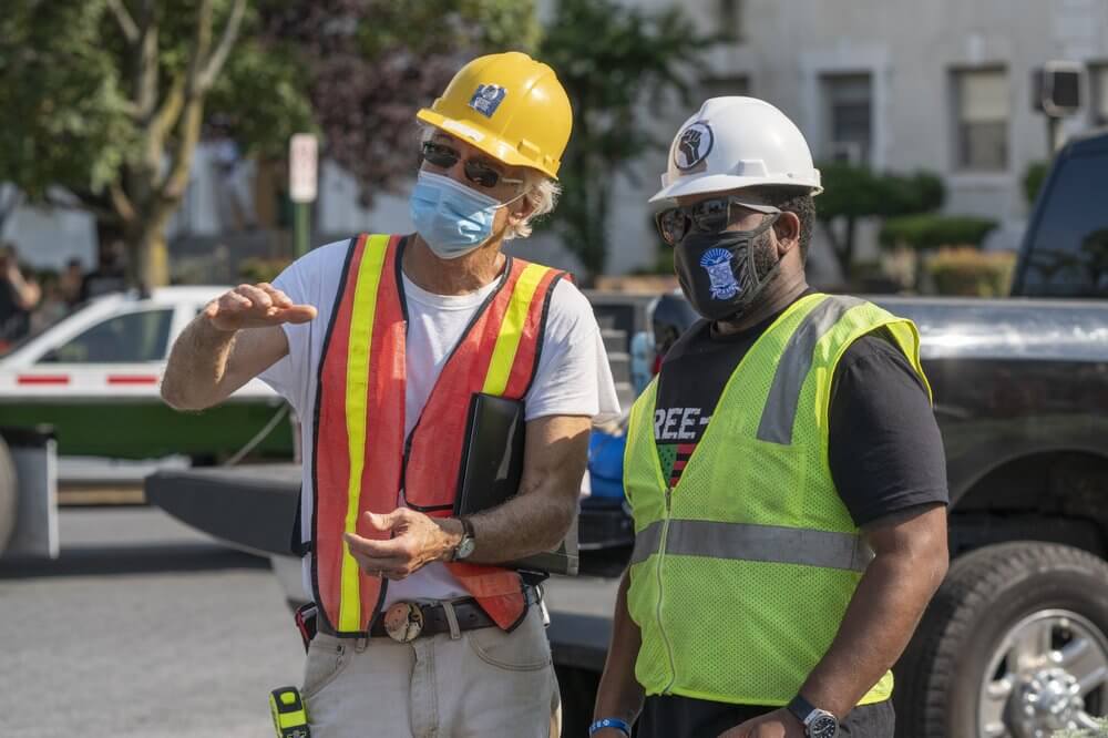 In this photo provided by Sanjay Suchak, Richmond sculptor Paul DiPasquale, left, talks with Devon Henry during the removal of the J.E.B. Stuart statue on Monument Avenue on Tuesday July 7, 2020 in Richmond, Va. Henry’s company won the contract to remove the Confederate Statues from the city of Richmond. (Sanjay Suchak via AP)