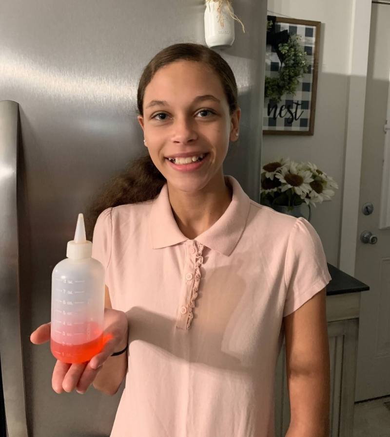 The student said she enjoyed presenting her idea and also liked making the solution. The secret recipe consists of 12 oz of water, a drop of food coloring – which also denotes the drink’s flavor – and the special concoction of age defying nutrients.