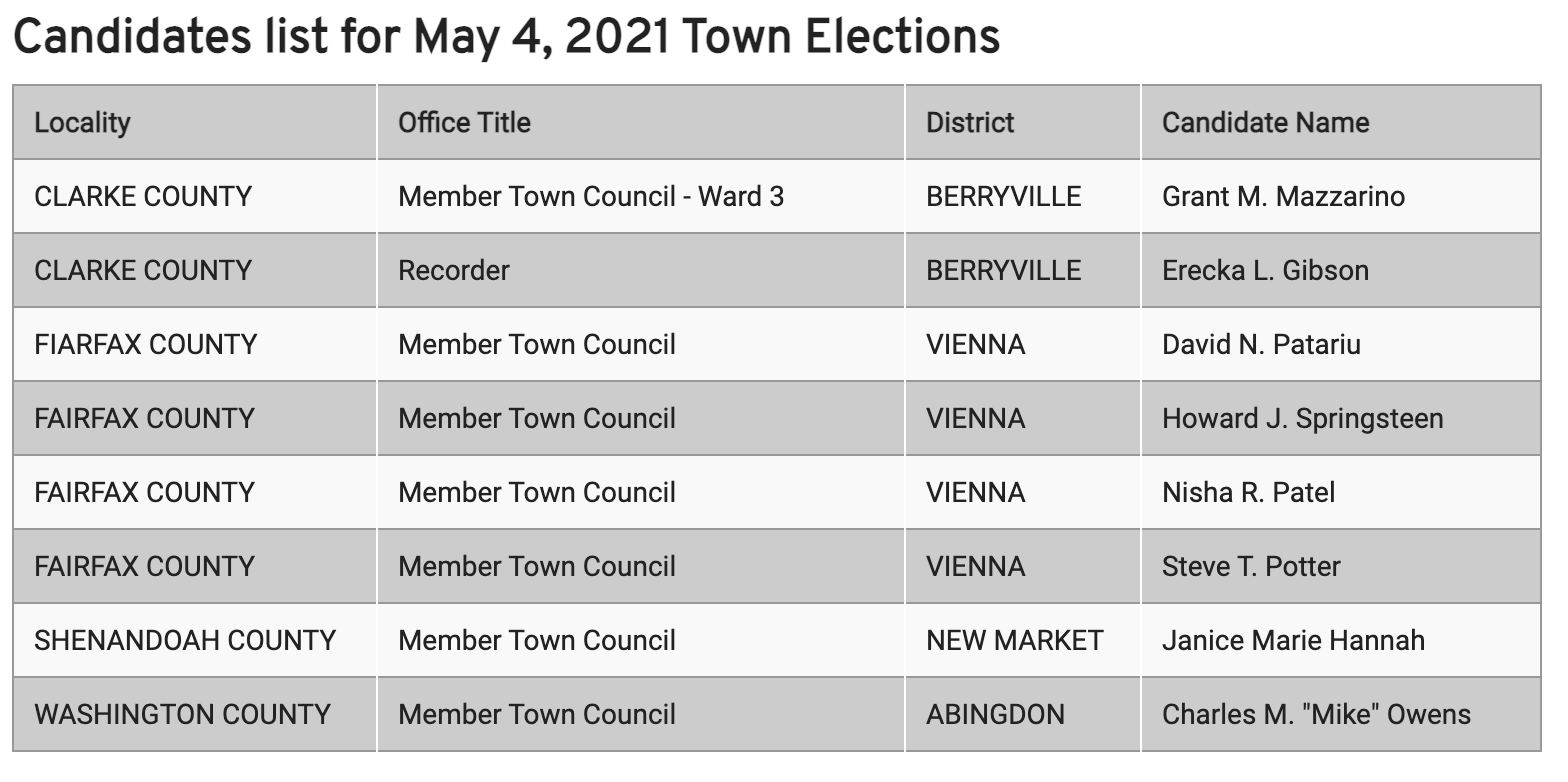 Not every town has an election this May, however. The chart below, provided by the VDOE, shows which localities are hosting elections and who is running for those offices.