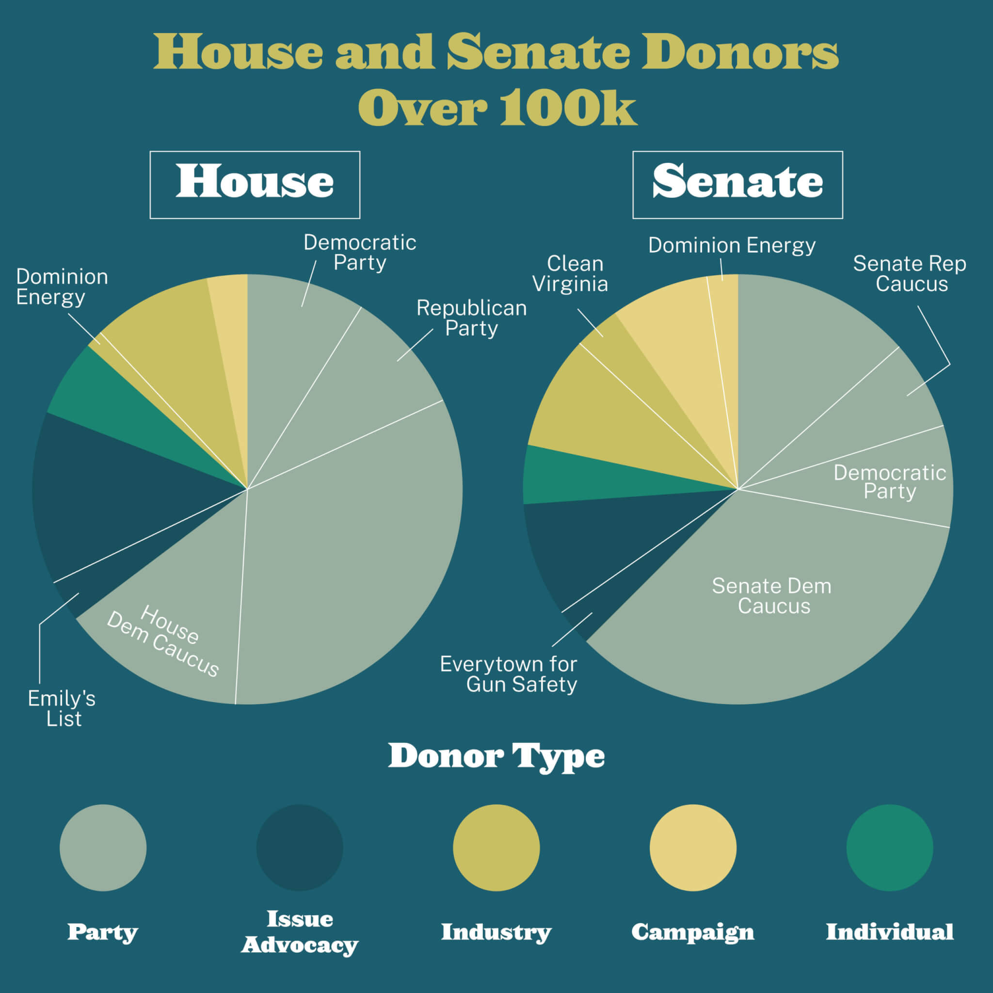 A list of the top donors to Virginia House and Senate races in 2019 reveals few surprises at first glance. The largest sources of cash for candidates are Party organizations. They lead by a large margin, followed by issue advocacy groups, like Clean Virginia or the National Rifle Association, and business interests.