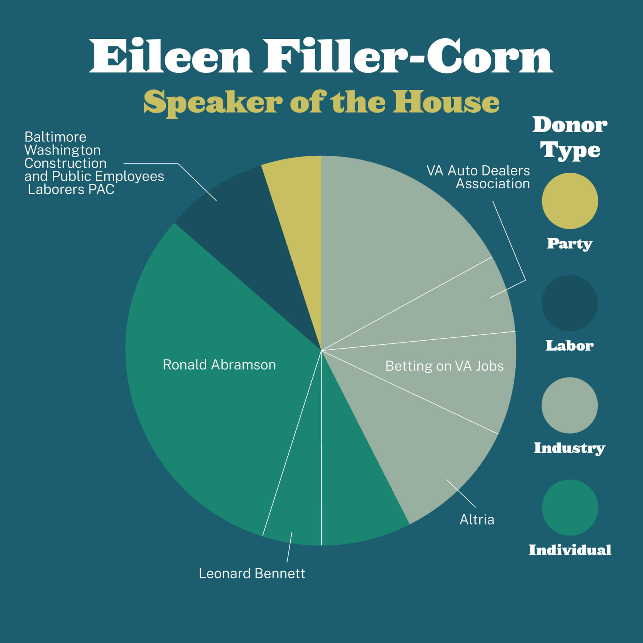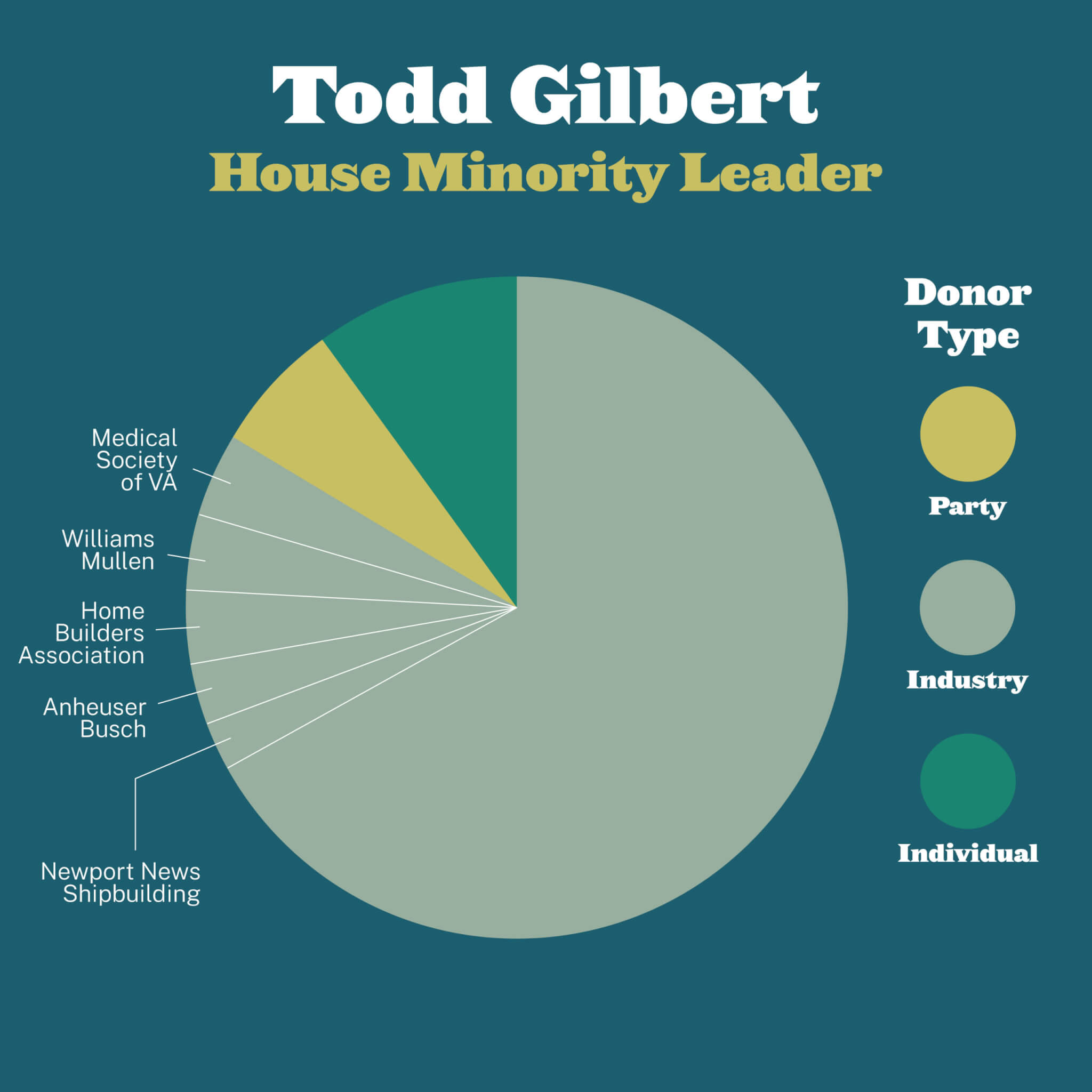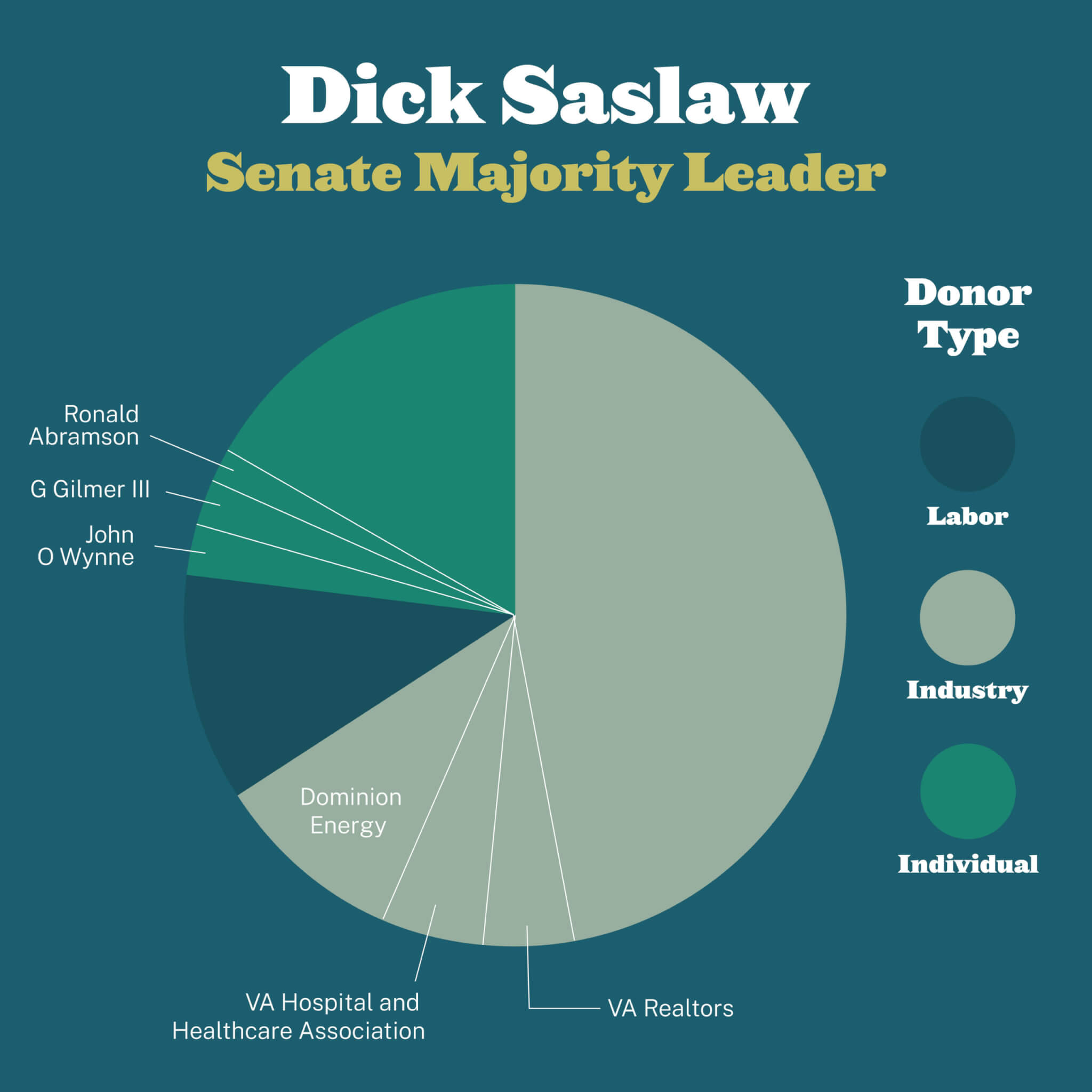In 2019, the Majority Leader of the Virginia Senate, Dick Saslaw (D-Alexandria), received less than $7,000 from the Virginia Democratic Party. Of the donations he received in 2019 that totaled more than $7,000, none were from Party organizations or partisan PACs. Instead, the majority of that money came from business interests like Dominion Energy. A smaller share of those donors came from labor organizations and private individuals.