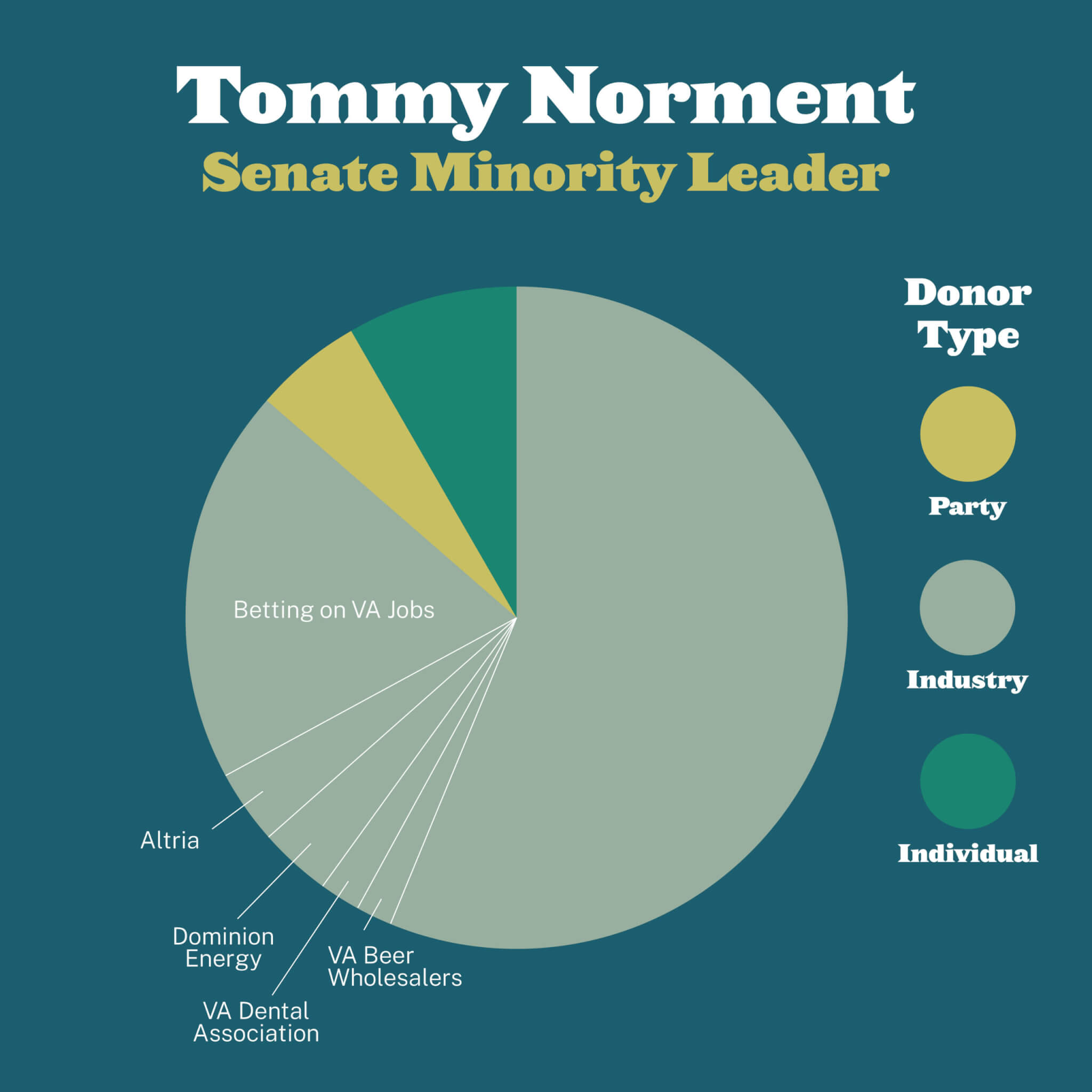 Senate Minority Leader Tommy Norment won his race by an overwhelming 22 point margin. He received hundreds of thousands of dollars in corporate cash, while taking next to nothing from Party organizations.