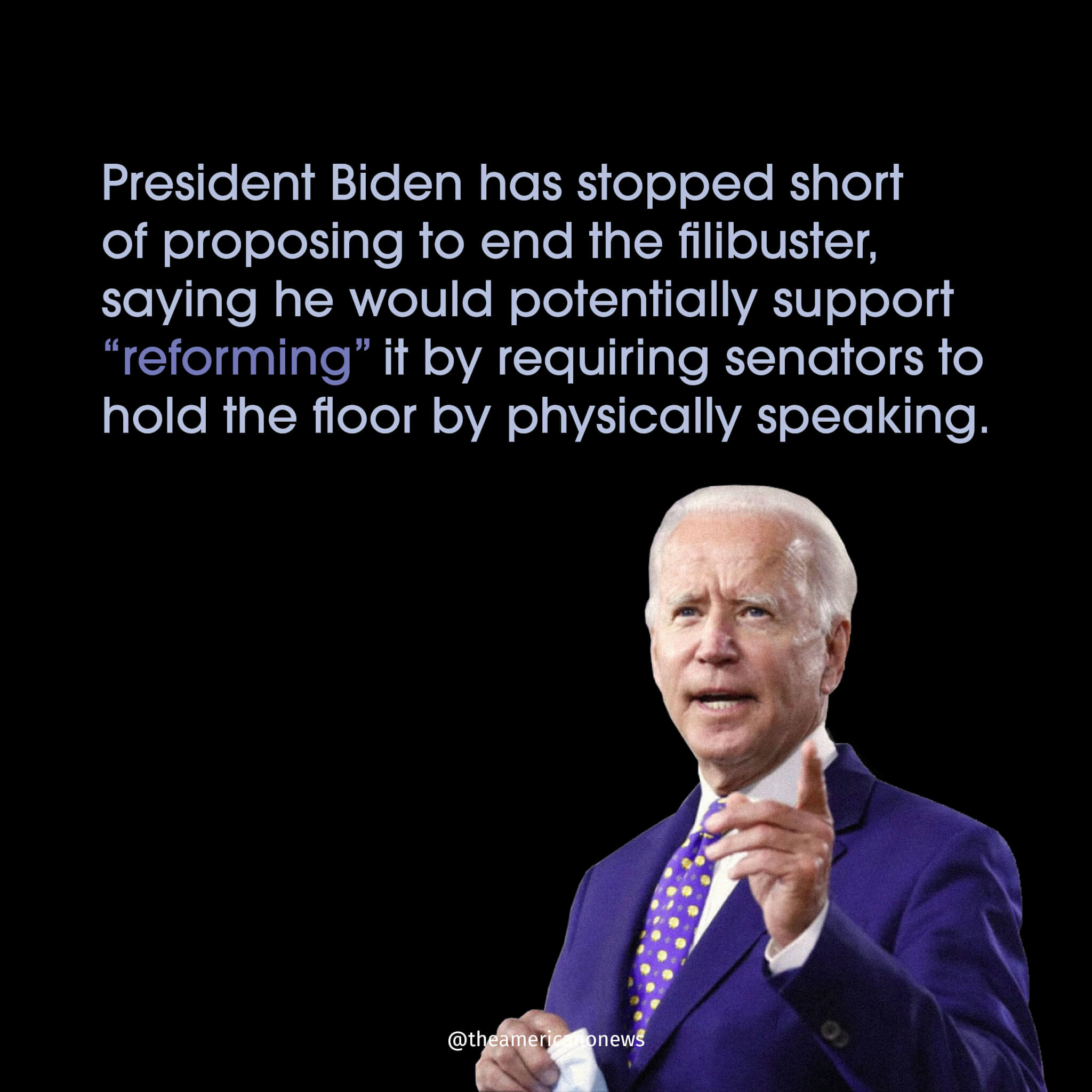 President Joe Biden is in favor of filibuster reform and has said he would support a smaller change instead of pushing to end the procedure right away. He has said he is in favor of re-implementing the talking filibuster.