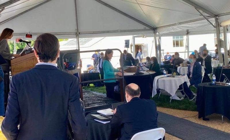 House Delegates met under a canopy outside while the Senate met at a giant event space at the Science Museum of Virginia a couple of miles away. Lawmakers were seated far apart and wearing masks instead of germ-carrying ties to help prevent the spread of the virus.