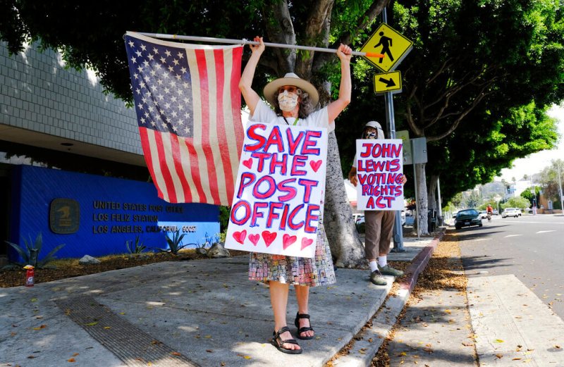 Erica Koesler, left, and David Haerle, both of Los Angeles, demonstrate outside a USPS post office, Saturday, Aug. 15, 2020, in the Los Feliz section of Los Angeles. The USPS has warned states coast to coast that it cannot guarantee all ballots cast by mail for the November election will arrive in time to be counted, even if mailed by state deadlines, raising the possibility that millions of voters could be disenfranchised.(AP Photo/Chris Pizzello)