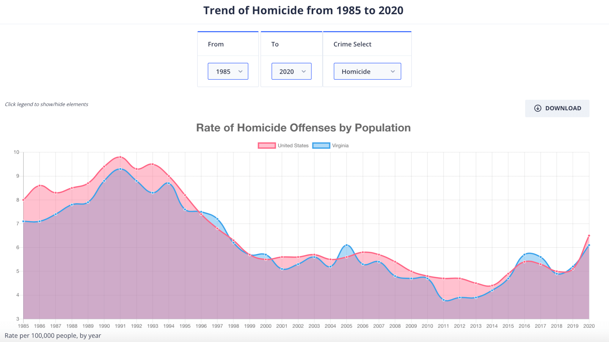 While Virginia’s murder rate has been more in line with the national average, it has remained at or below it for 29 of the past 36 years.
