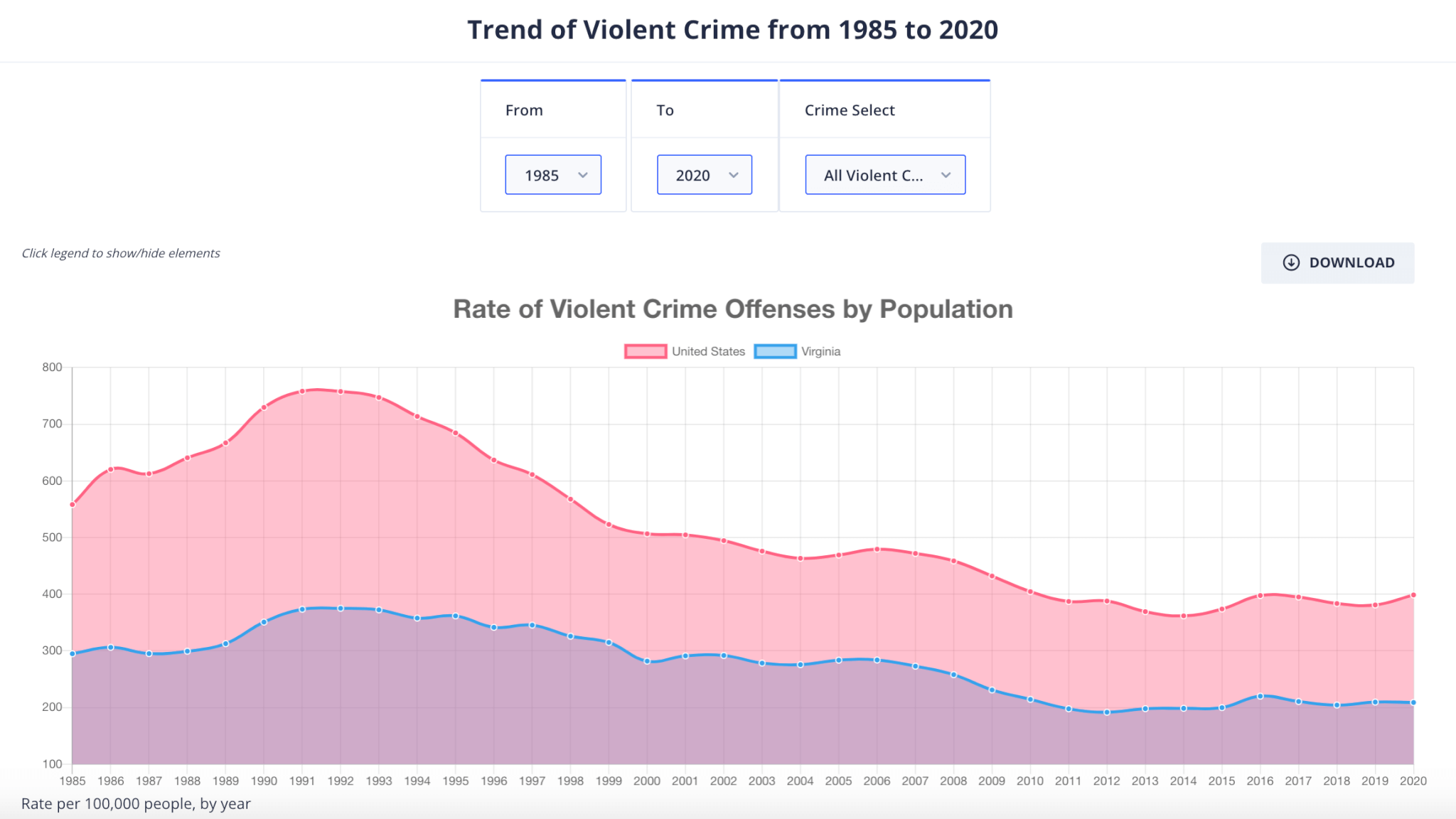 In every year since 1985 (which is as far back as the FBI’s data goes), Virginia’s violent crime rate has been substantially lower than the national rate. In fact, since peaking in the early 1990s, the statewide violent crime rate has been on a steady, three-decade long decline. As you can see in the chart below—which is from the FBI’s Crime Data Explorer—the rate of violent crimes in Virginia has been about half the national level in most years since 1985.