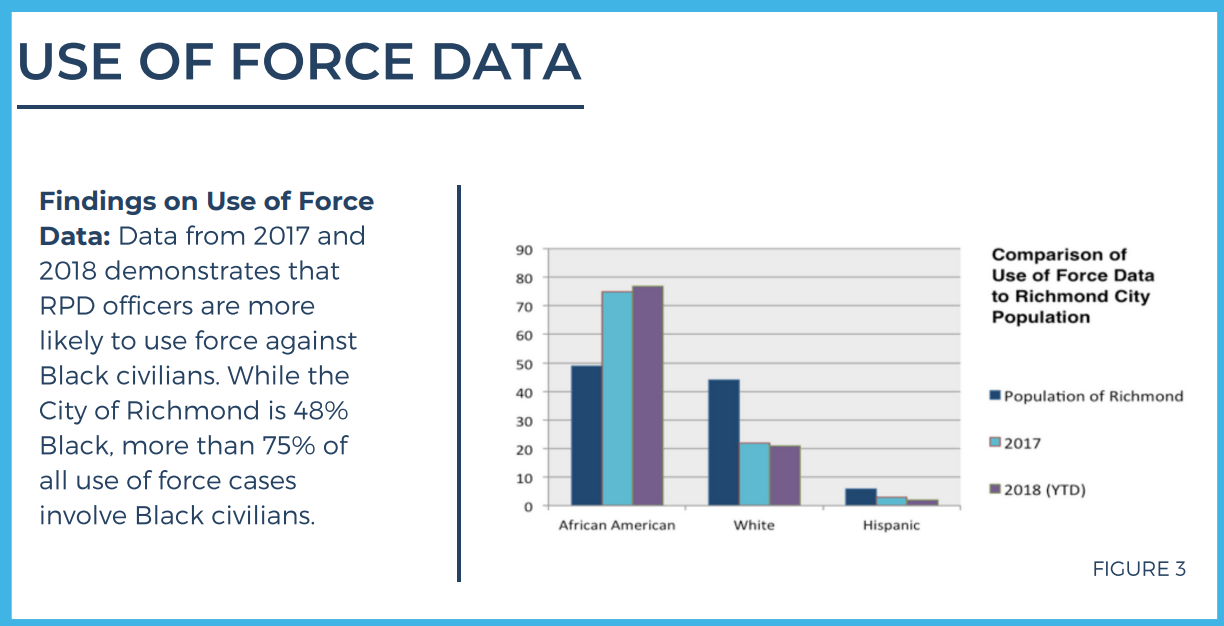 According to a report compiled by RTAP, 75% of all use of force cases against the department from 2017-2018 involved Black people. During that time, Black people made up only 48% of Richmonders.