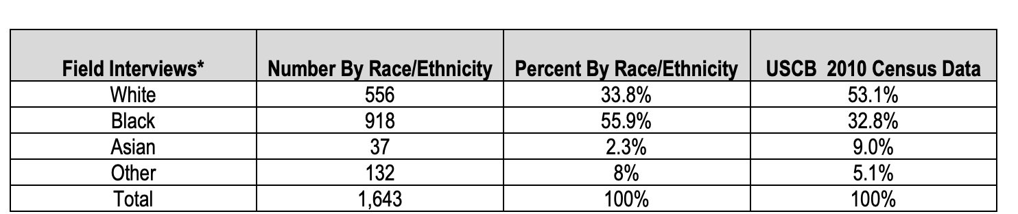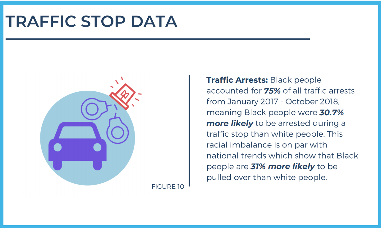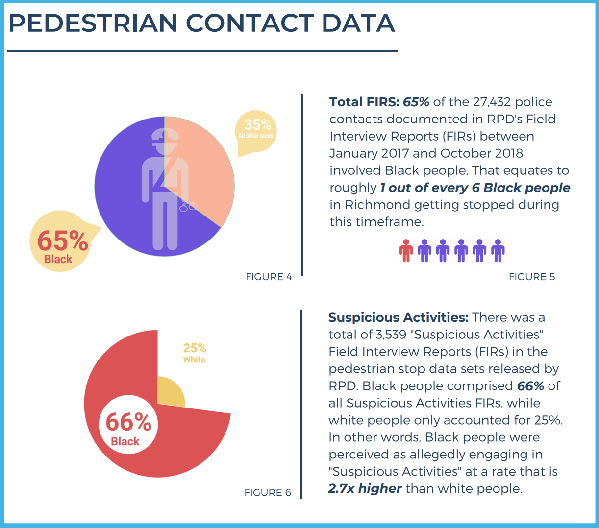 The same report demonstrates that 65% of documented interactions between police and pedestrians involved Black civilians. That means Richmond police stopped one out of every six Black people in Richmond during that time. Black people also made up 75% of all traffic arrests in Richmond from January 2017-October 2018.