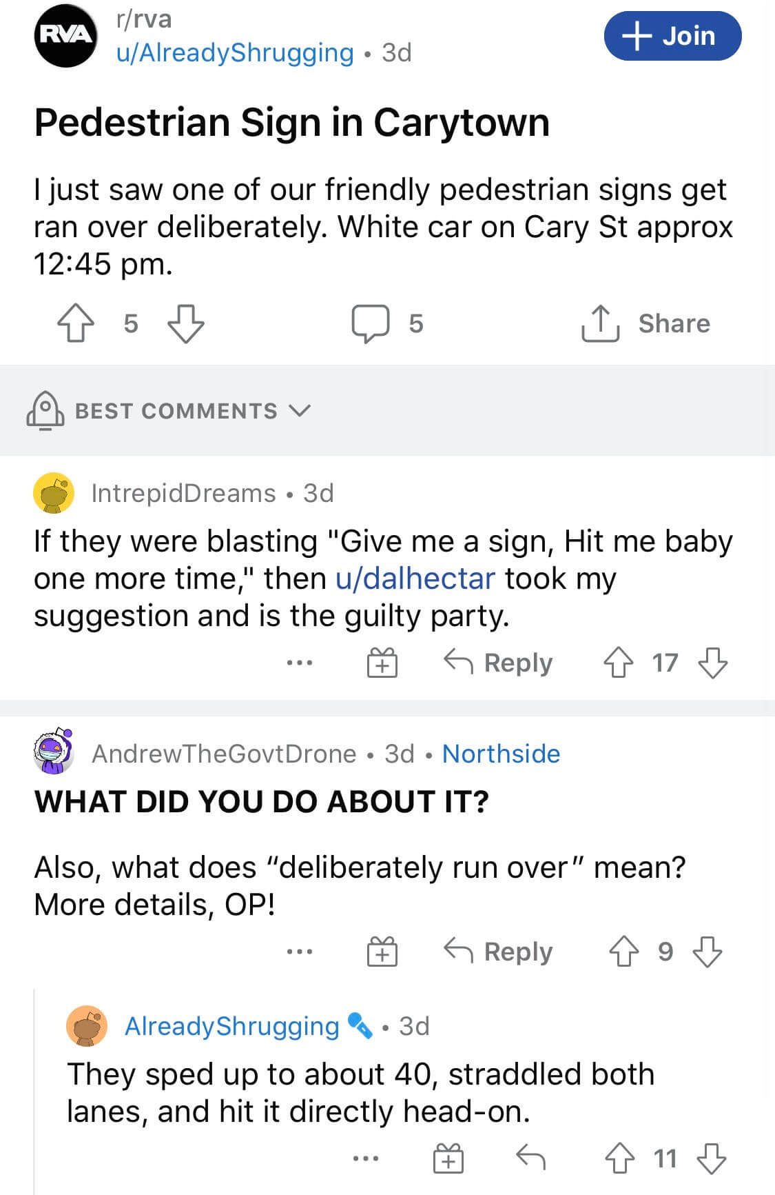 Dozens of Reddit users on r/rva, a subreddit dedicated to the city of Richmond, also note that another problem is the position of the signs. Since they’re in the middle of the road, cars frequently ran them over, flattening the plastic posts and scattering the signs.