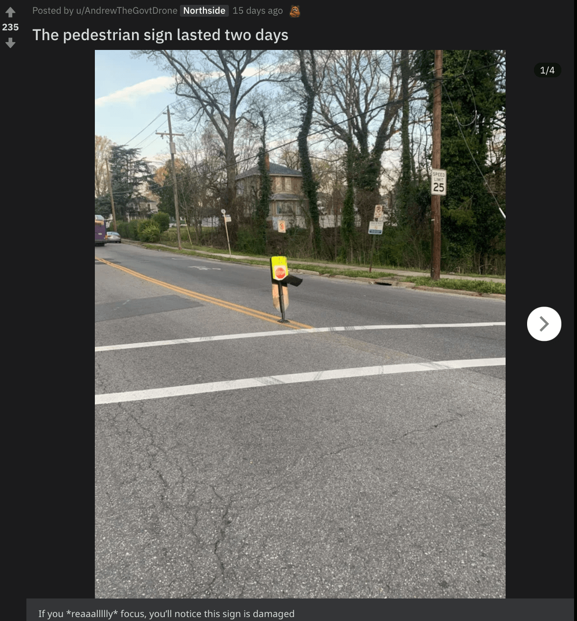 One sign in particular, at a crosswalk on Brookland Park Boulevard in Northside, captivated the subreddit. According to users there, who were tracking the sign’s status over the course of three weeks, the sign lasted barely two days before cars flattened it for the first time.