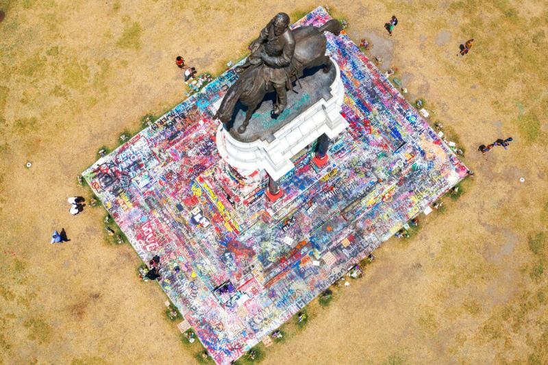 The Lee statue, meanwhile, was transformed into a bustling hub of activity for demonstrators protesting police brutality and racism. The giant concrete pedestal of the statue is covered by colorful and constantly changing graffiti, many of the messages profanely denouncing police and others demanding an end to systemic racism and inequality.